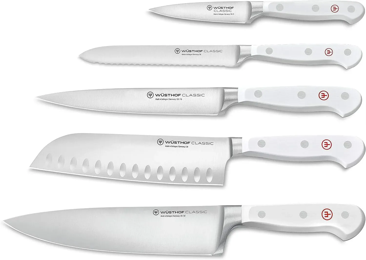 El juego de cuchillos Wüsthof Classic White de 5 piezas con santoku es un juego versátil que puedes utilizar para preparar muchos platos diferentes. Con el afiladísimo cuchillo de chef y el santoku con hoyuelos podrás cortar sin esfuerzo verduras, carne y pescado. La diferencia entre estos cuchillos es la técnica de corte. Con el cuchillo de chef se hace un movimiento de balanceo, y con el santoku (la versión japonesa del cuchillo de chef) se corta de atrás hacia adelante. Durante cada movimiento, el filo pierde el contacto con la tabla de cortar. Uno no es mejor que el otro, depende de tu preferencia personal decidir con cuál te quedarás.