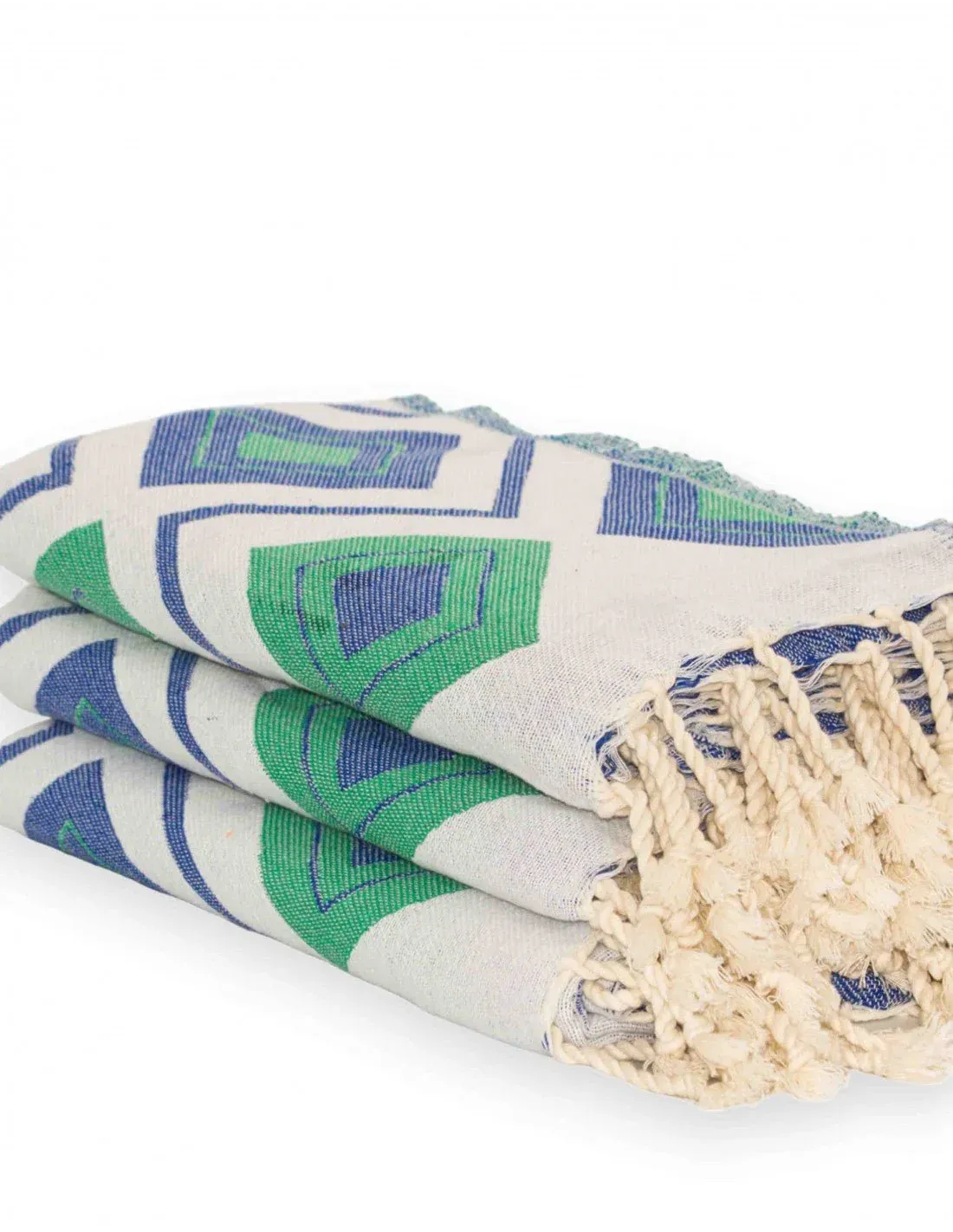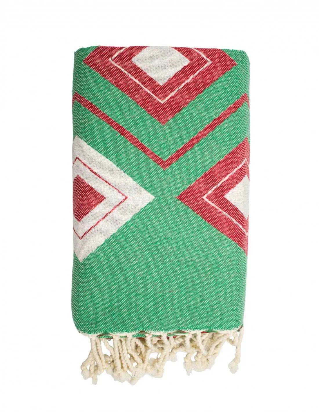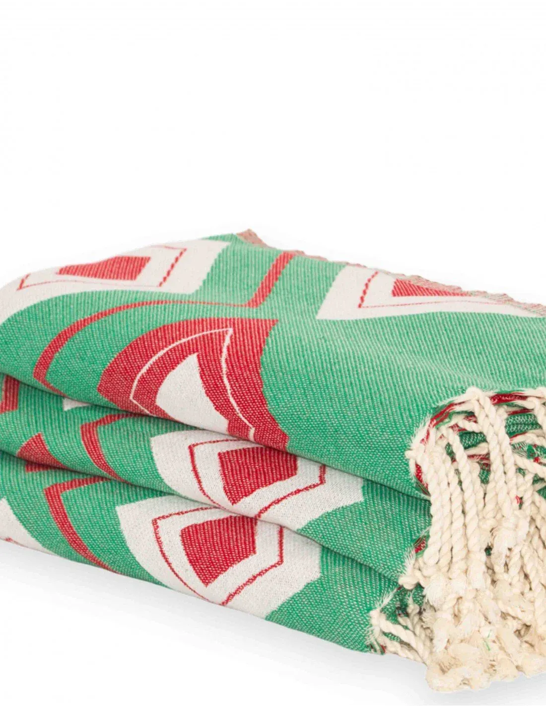 Toalla de playa tejida con arte en jacquard con colores verde-rojo-blanco y blanco-azul-verde. Esta versátil toalla no solo es un accesorio, sino una expresión de estilo y comodidad. Su diseño tejido añade un toque sofisticado, convirtiéndola en la elección perfecta para momentos de relajación en casa o experiencias al aire libre. Descubre la autenticidad y versatilidad, una fusión de practicidad y refinamiento que realza cada ocasión.