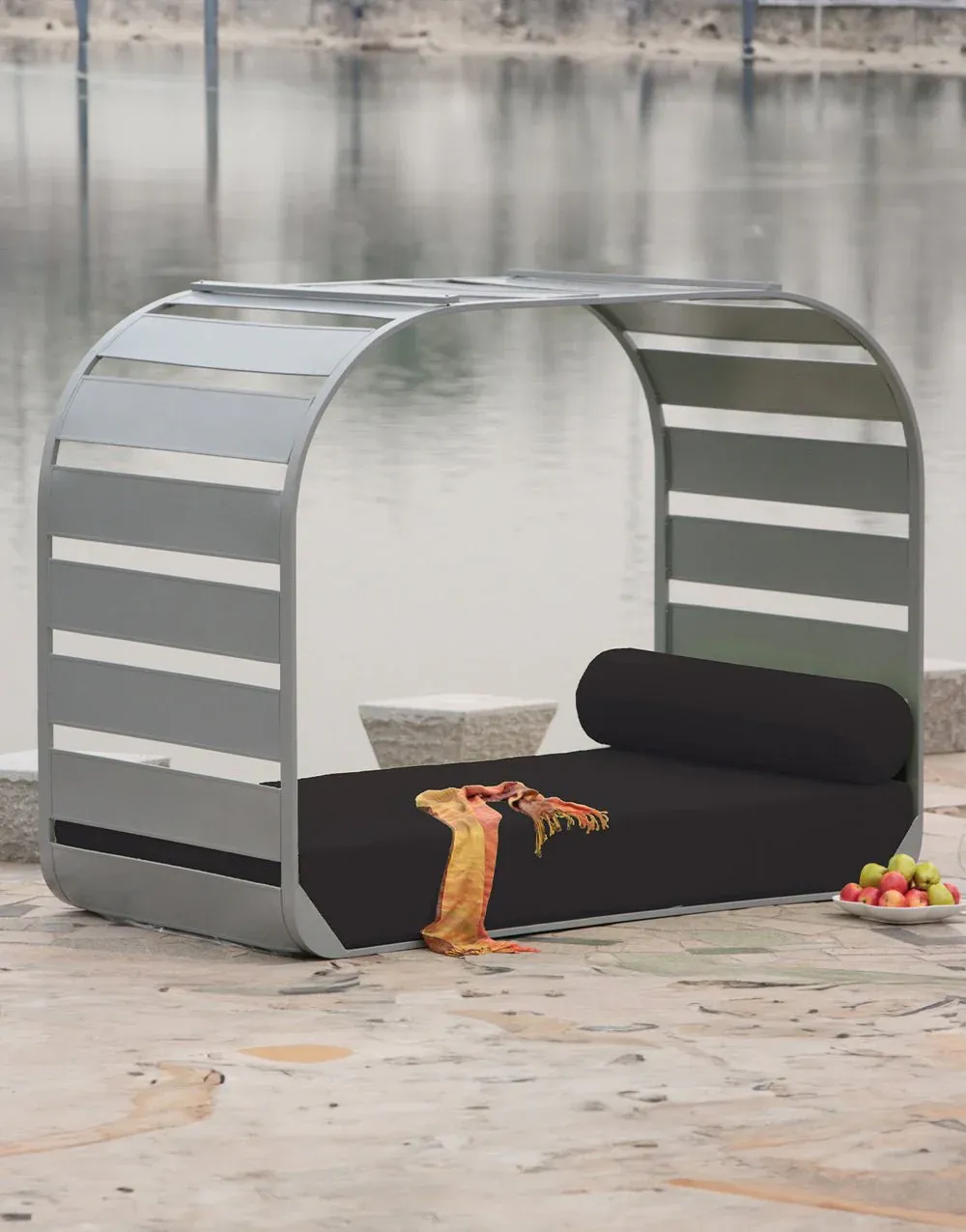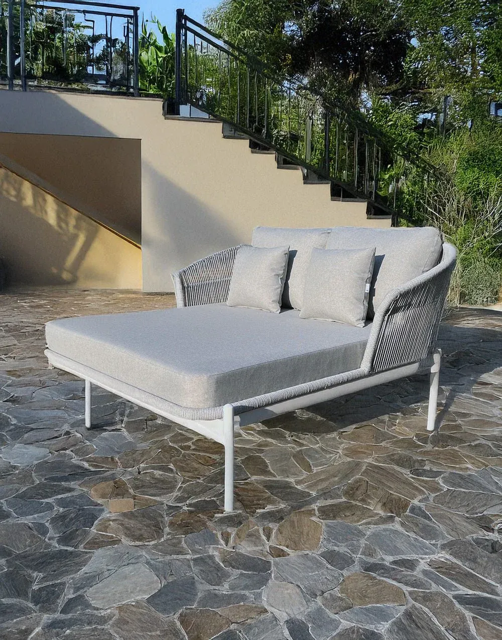 Tumbona de exterior fabricada en aluminio con cojines en poliéster de color negro.
