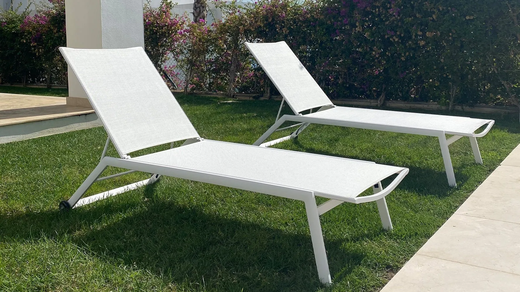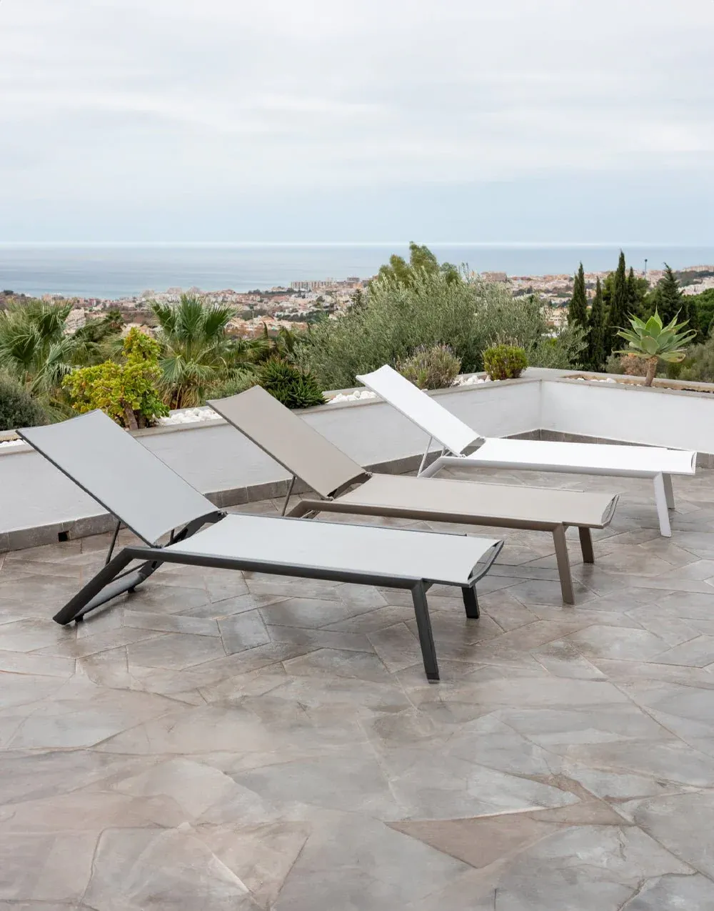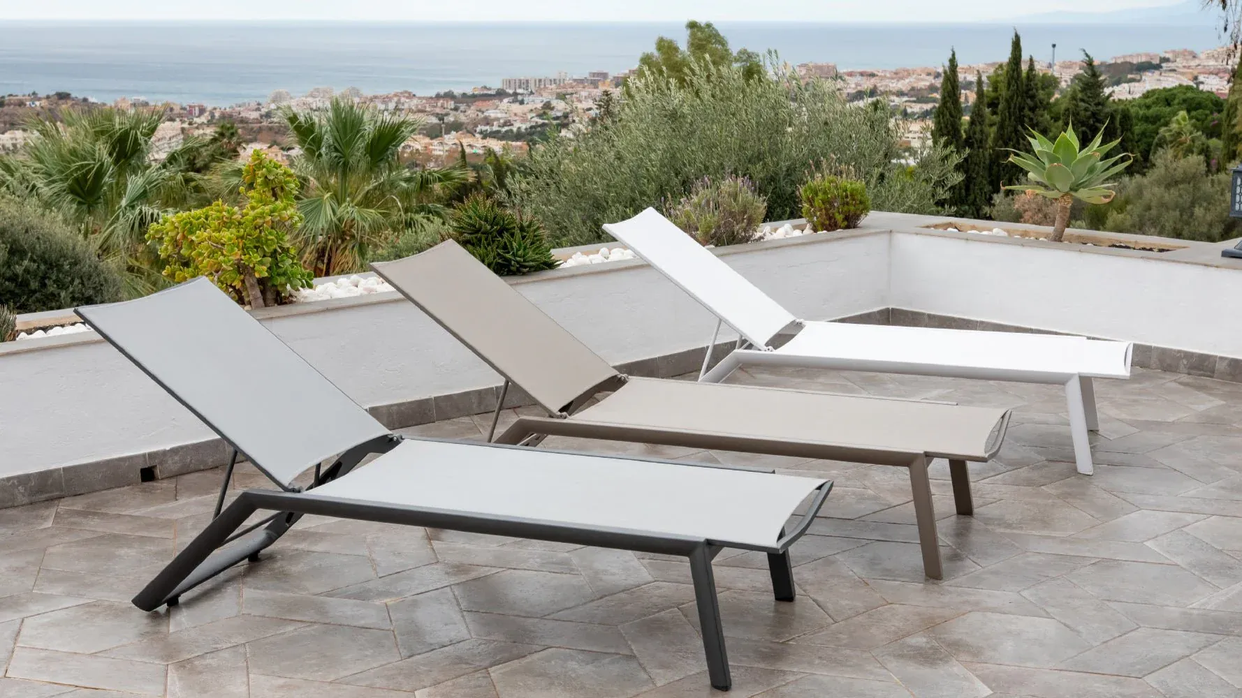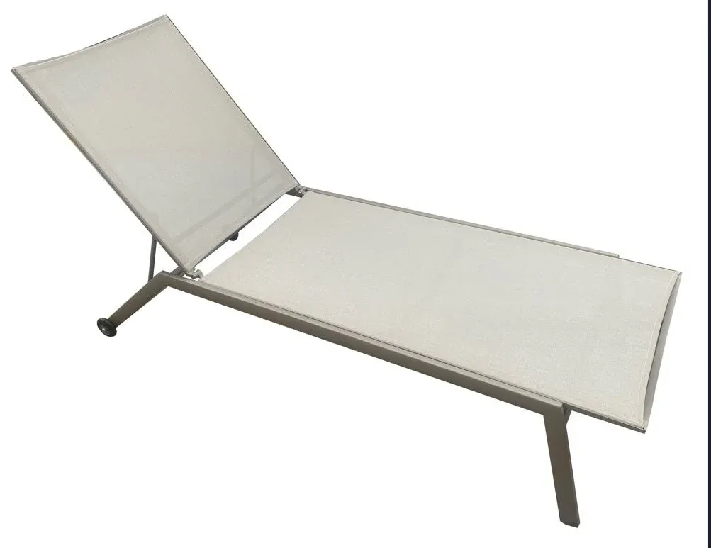 Tumbona de exterior fabricada en aluminio colores antracita, blanco o topo poliéster en color beige, blanco y gris, apilable con ruedas.
