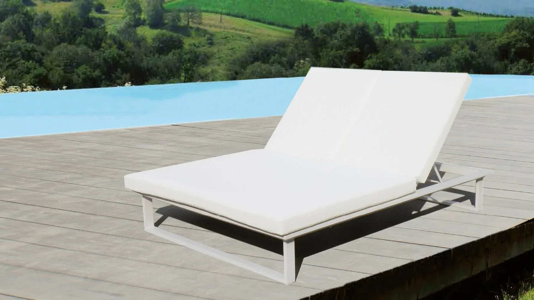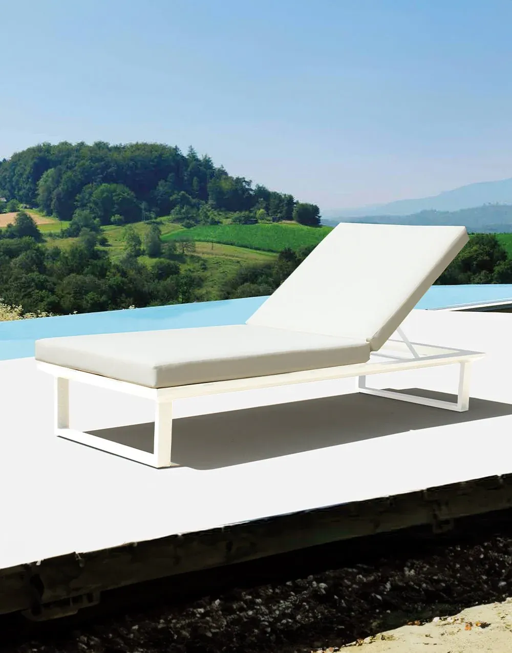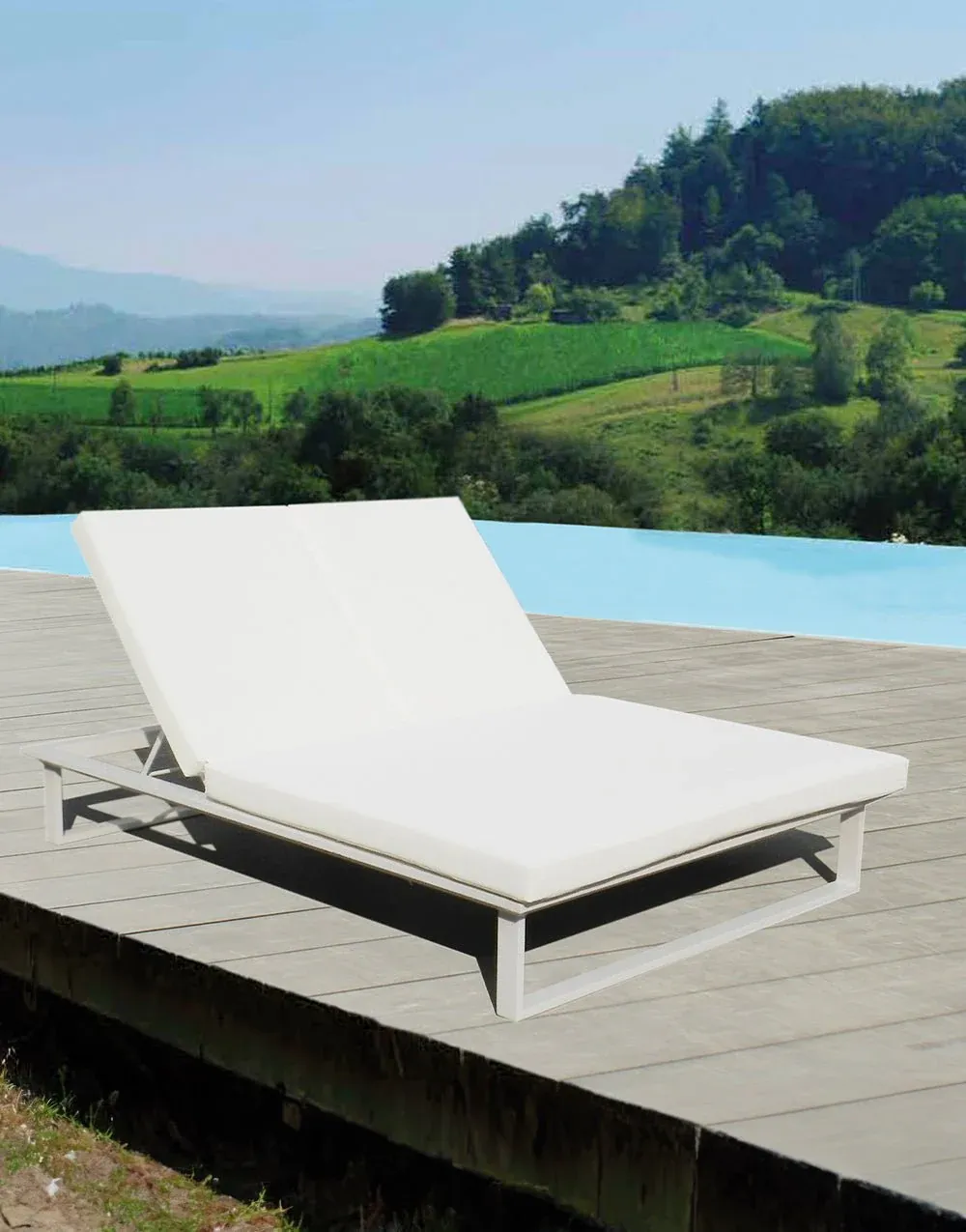 Tumbona de exterior fabricada en aluminio color blanco con cojines en poliéster en color blanco. Disponible en dos medidas.