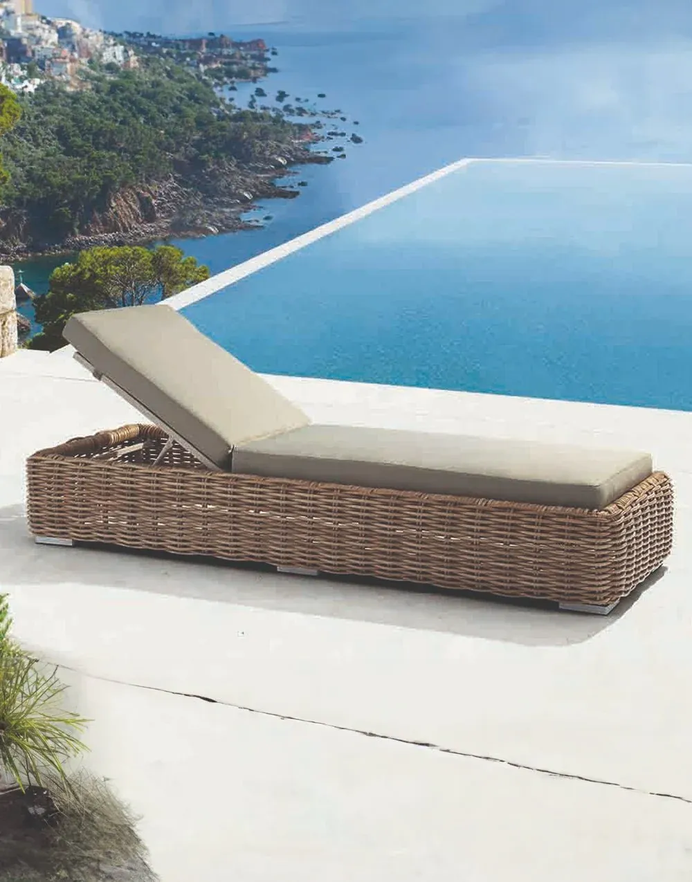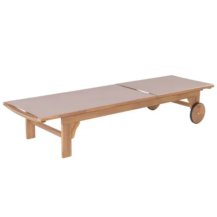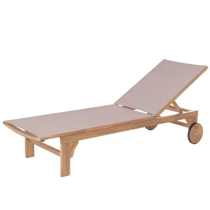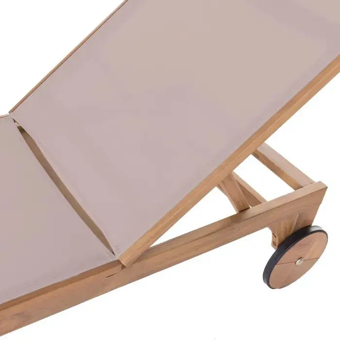 Original y cómoda tumbona totalmente abatible con ruedas fabricada en madera maciza de acacia y tejido sintético de color blanco y beige.