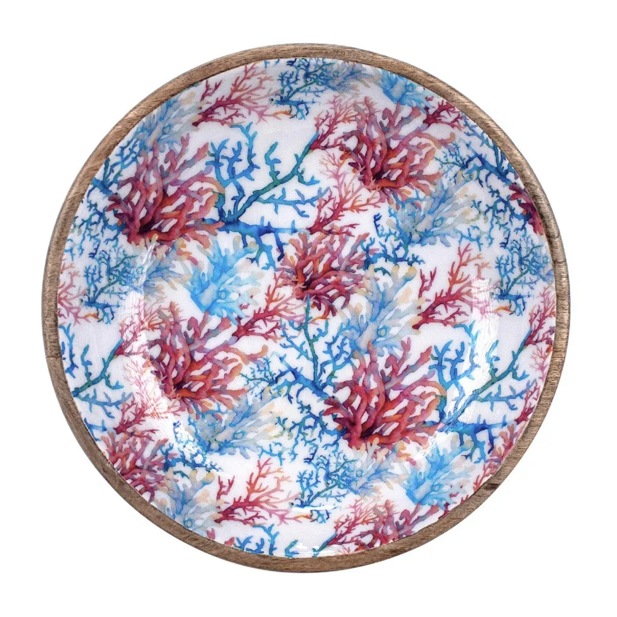 Vajilla con motivos marinos de corales fabricado en madera natural con colores azul, rojo y blanco.