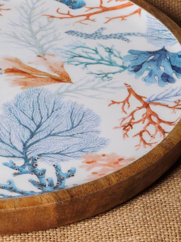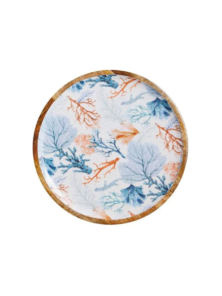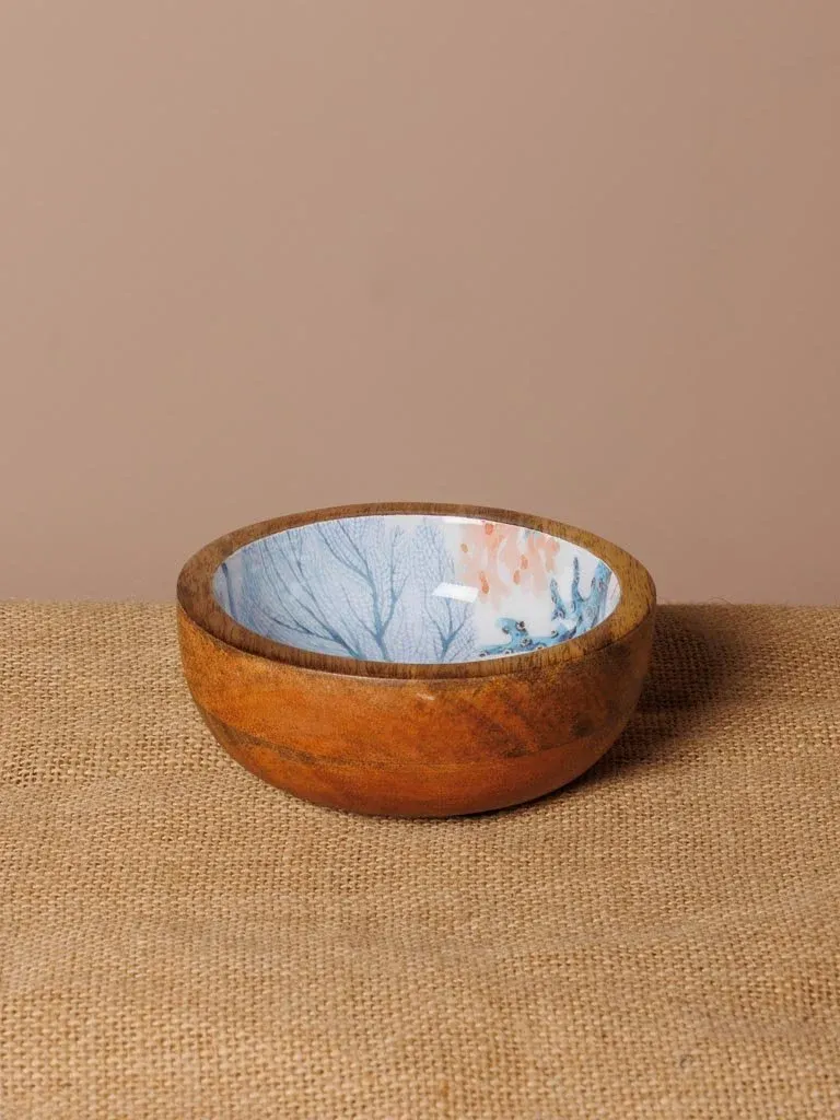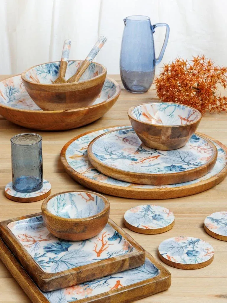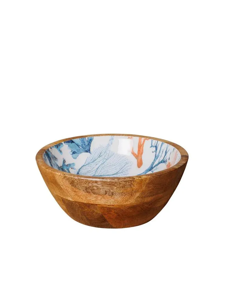 Preciosa vajilla fabricada en madera de mango color natural y en su interior con dibujos de corales esmaltada en blanco, azul y marrón. Disponible varias medidas.