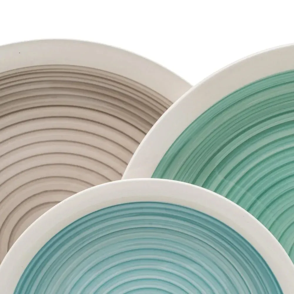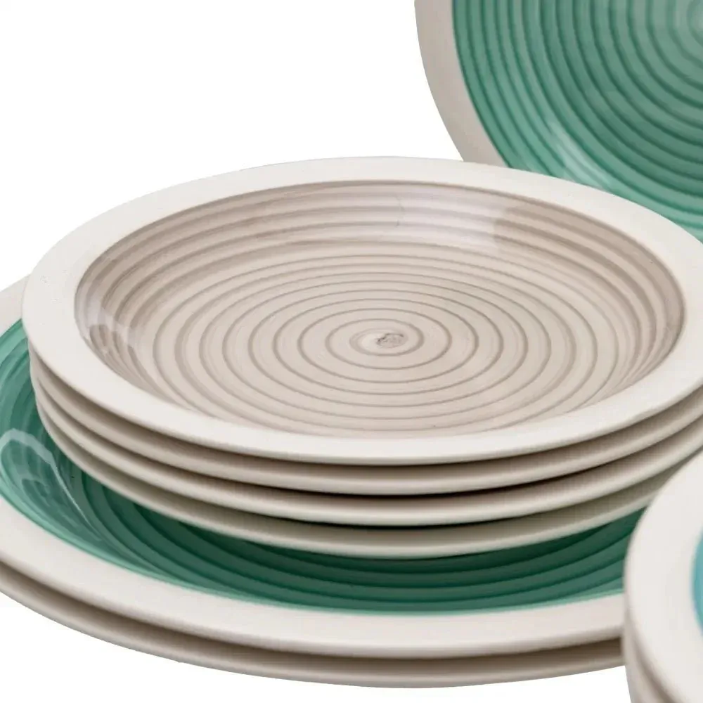 Vajilla completa de 18 piezas fabricada en gres en colores azul, verde y gris. Pintada a mano.