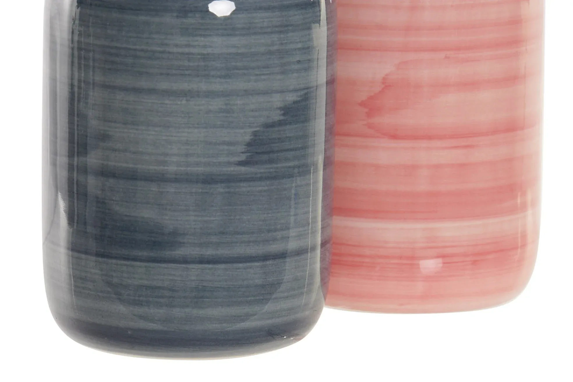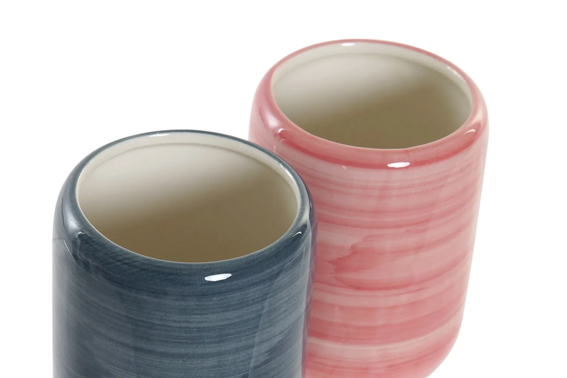 Vaso para el baño fabricado en gres en colores azul y rosa.