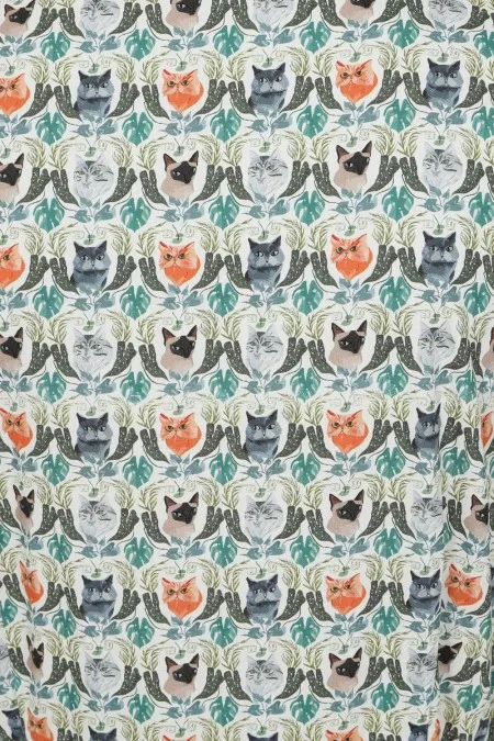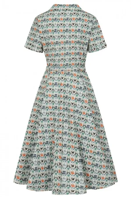 Vestido de algodon en vuelo con estampado de gatos retro.