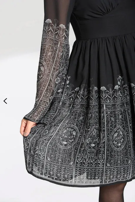 Vestido medio de gasa negro con estampado de puerta adornada en la parte inferior de la falda y en las mangas