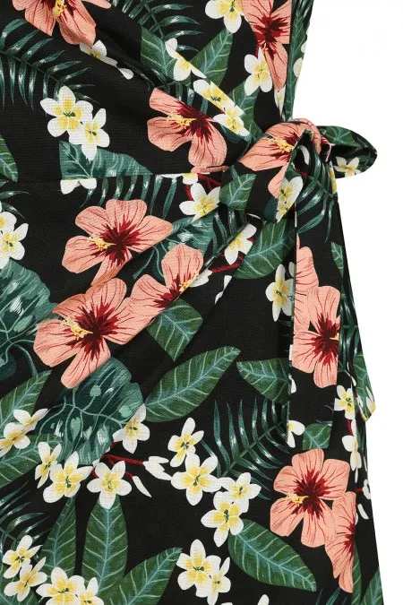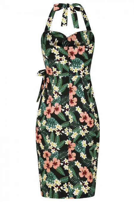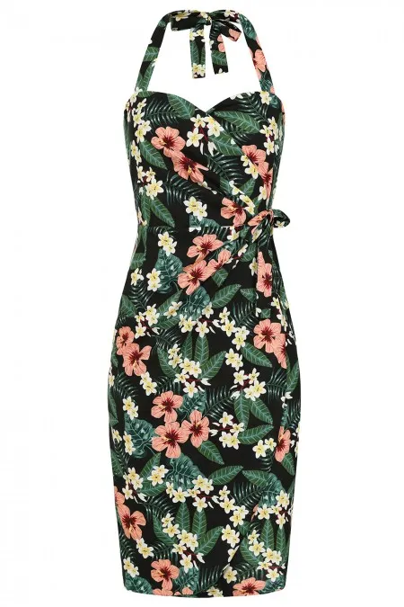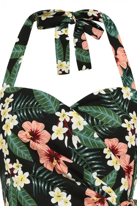 Este vestido pareo Evie de tiara tropical, inspirado en los años 50 y de Banned Retro, está confeccionado en algodón texturizado y presenta un estampado tropical veraniego, perfecto para una cena de verano. Con un lazo en el cuello halter y un favorecedor lazo lateral en la cintura, este vestido es de una belleza clásica.