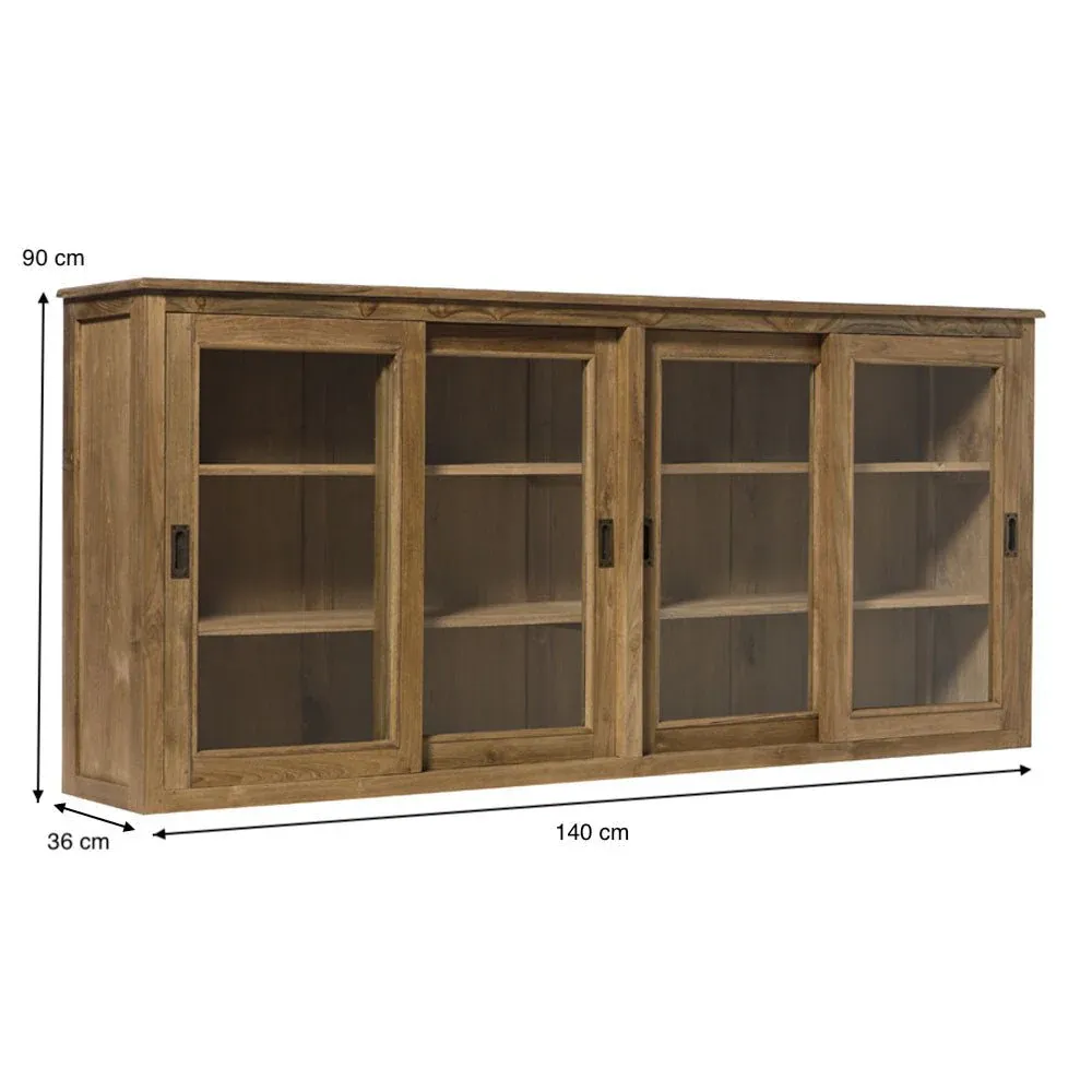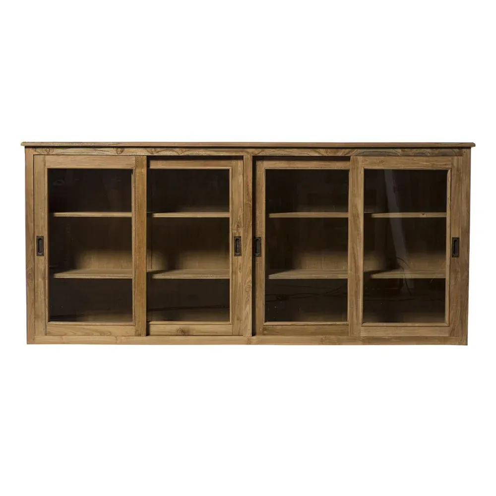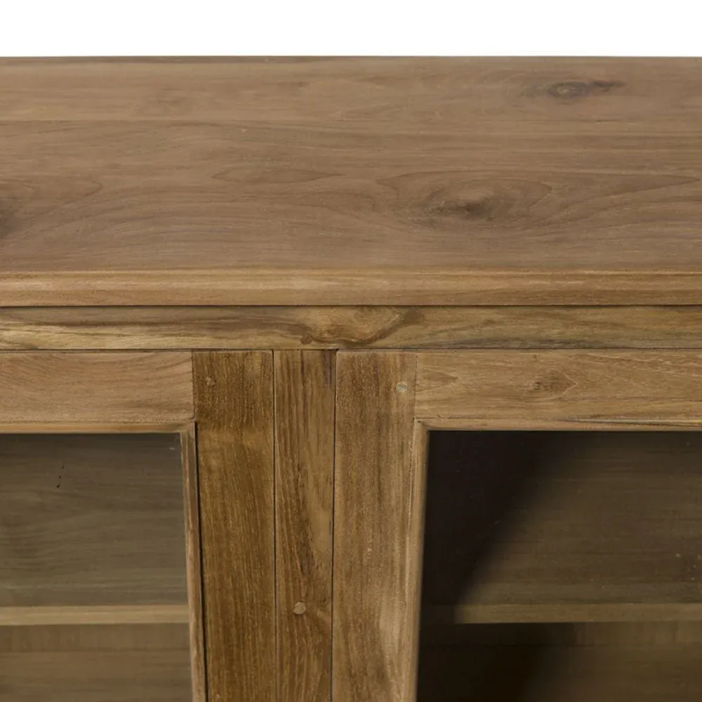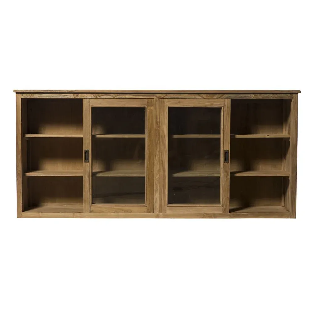 Vitrina compuesta por 2 módulos cada módulo tiene 2 estantes interiores  y 2 puertas de cristal correderas fabricada en madera de teca en color natural combinado con cristal transparente.